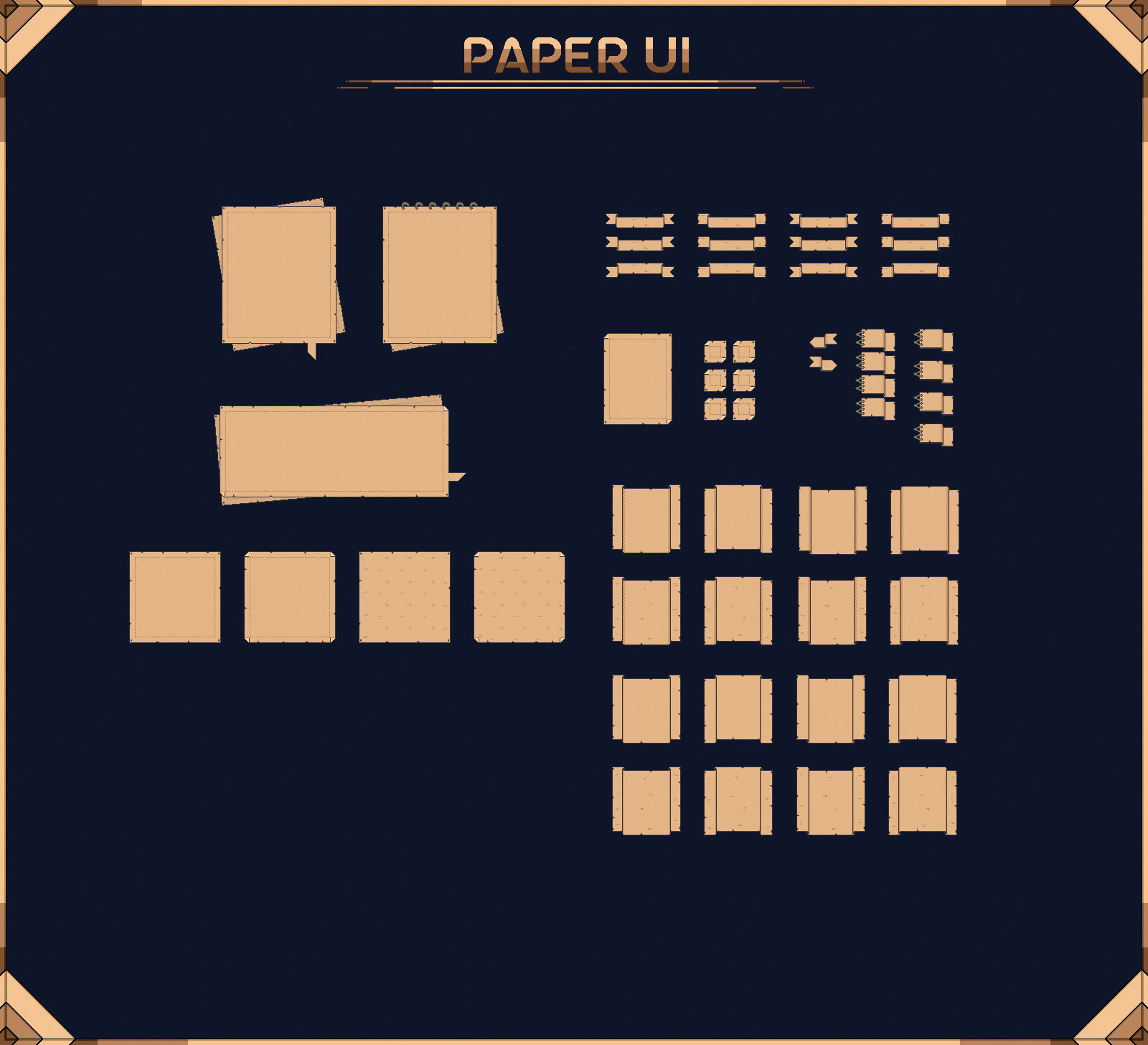 A complete paper-style user interface collection, perfect for menus, status screens, and inventory layouts.
