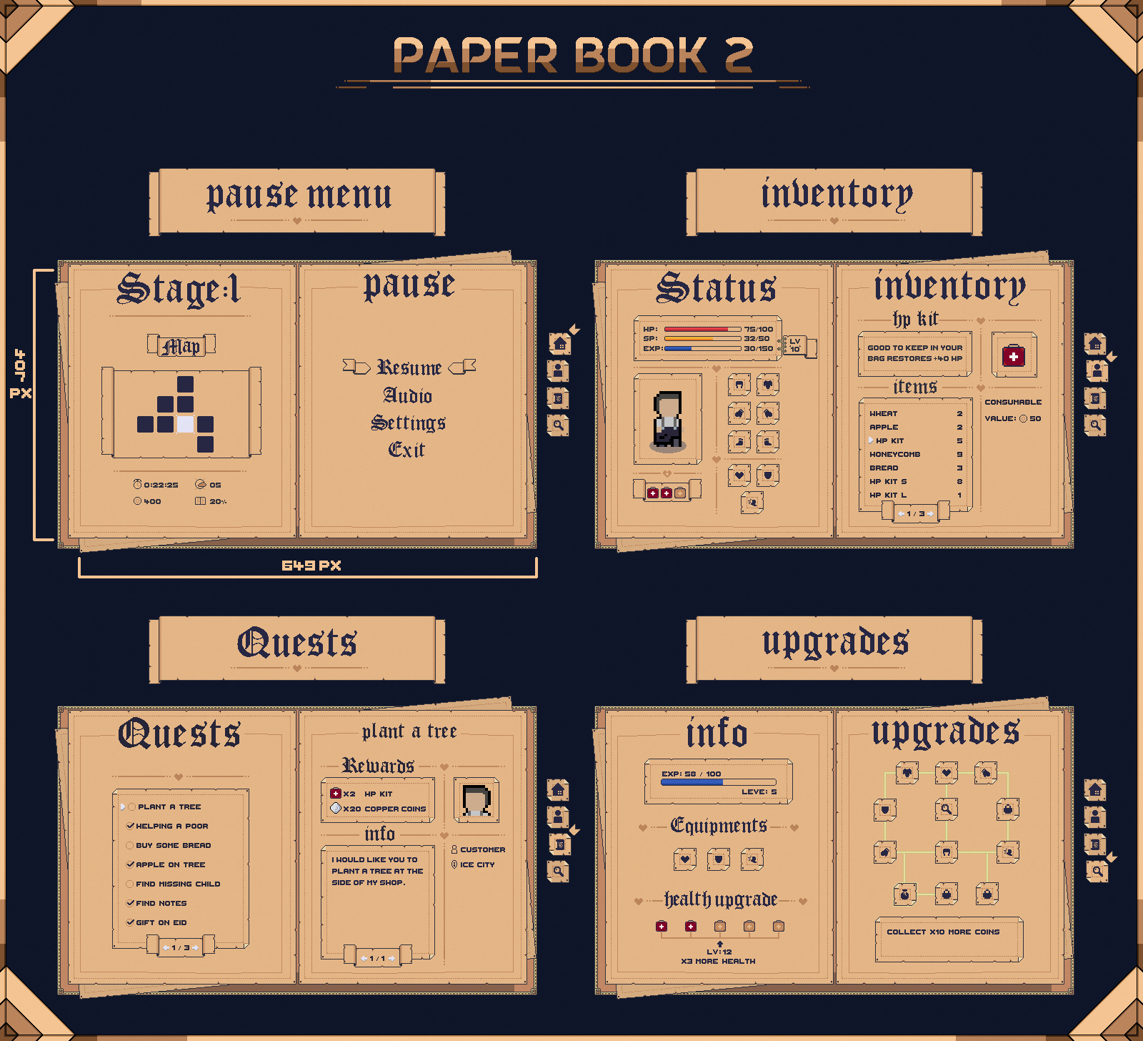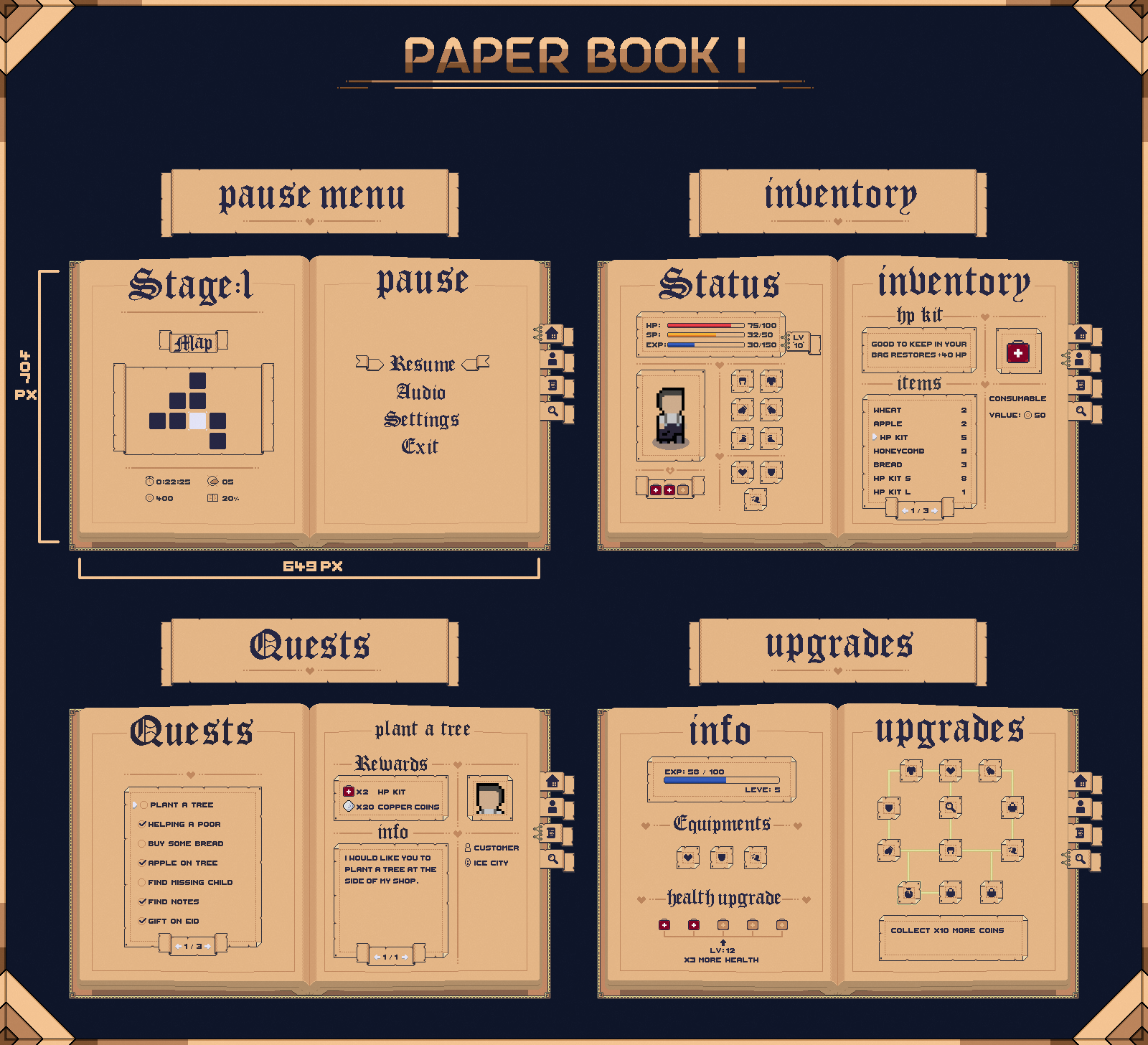 Build immersive menus and interfaces with beautifully animated pixel art books and paper UI.